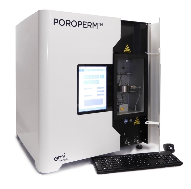 Poroperm 1000 是比利时Porometer 公司和荷兰Twente 大学欧洲膜所EMI合作开发的用于测试膜材料纳米孔隙分布的仪器,该仪器采用精确控制的可凝聚汽体和不可凝聚气体混合气体在不同蒸汽分压和恒温恒压差条件下通过膜材料样品,监测膜孔隙因为毛细凝聚而产生的气体渗透率变化,根据凯尔文方程计算出在对应不同孔径下气体渗透率的变化,从而计算出膜材料通孔的分布情况,区别于其他孔径测试方法,Poroperm 1000是在低压常温条件下测试,几乎保持样品无损,有效测试孔径范围是0.5---50nm。